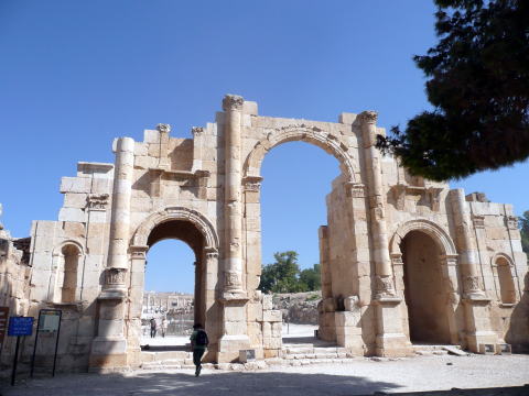 | バスから降りて200メートルほど歩くと、ジェラシュ遺跡の入り口にやってきます。この門はハドリアヌス門とも呼ばれています。129年、ローマ皇帝、ハドリアヌス(在位:117〜138)が訪れたのを記念して建設されました。ハドリアヌス帝はエルサレムを「アエリア・カピトリーナ」として作り替えた皇帝でもありました(135年)。(参考年表) |