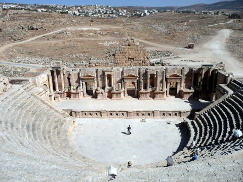 | ゼウス神殿の少し西側に南劇場があります。これは見事に今日まで残されています。遠くのほうに現在のジェラシュの街並みを眺めることができます。 |