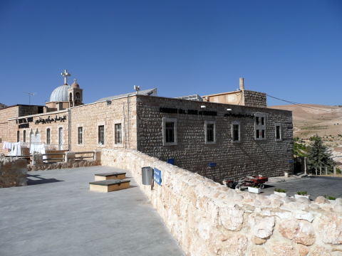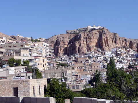 | 今日はパルミラに行く予定ですが、その前にマアルーラ村とクラック・デ・シュヴァリエに立ち寄ります。 マアルーラ村はキリスト教徒の街であり、今でもアラム語が話されている街としても有名です。つまり、イエス=キリストがしゃべっていた言葉が今でも使われているのです。ここは、ダマスカスから50キロほど北の山間(アンチ・レバノン山脈の東麓)に位置しています。 ここからだと少し分かりづらいのですが、山の頂上左側の丸いドームが聖サルキス教会です。右側の大きな建物はホテルです。マアルーラの街は山の崖にへばりつくようにできています。 |