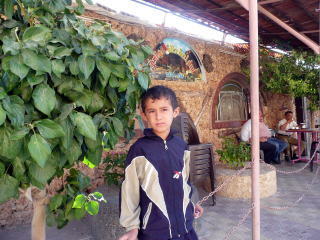 | 標高1650メートルの小高い山に登る途中、小さな喫茶店でアラム語で歌ってくれる少年がいました。そこから聖サルキス教会とそのドームが見えています。 |
