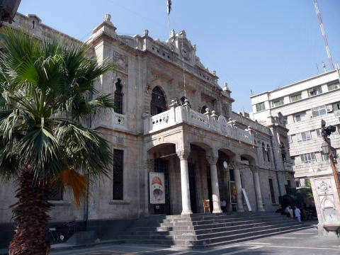 | 【左】美しいステンドグラスの構内ですが、大統領の写真に少し違和感を感じたりします。 【右】駅の前は大通りとなっていて、多くの車が行き交っています。 |